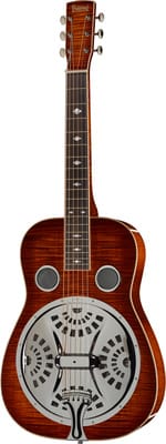 De Beard Guitars E-Model SN ASB is een Squareneck resonator gitaar met een moderne “open body” constructie en een Spider cone. De zij- en achterkant van de gitaar zijn gemaakt van massief curly maple (esdoorn), terwijl het bovenblad ook van massief curly maple is. De hals is gemaakt van curly maple en heeft een ebben fretboard met acryl pearloid “snowflakes” fretboard inlays. De gitaar heeft 19 frets en de hals-body overgang bevindt zich bij de 12e fret. De topkam is gemaakt van been en heeft een breedte van 47,6 mm (1,88”). De scale van de gitaar is 635 mm (25”). De binding is gemaakt van curly maple en de brug is van ebben op esdoorn. De gitaar heeft Waverly mechanieken en wordt geleverd met D’Addario EJ-42 .016 – .056 snaren af fabriek. De kleur van de gitaar is Amber Sunburst en hij wordt geleverd inclusief een Beard deluxe koffer. De gitaar is gemaakt in de USA.