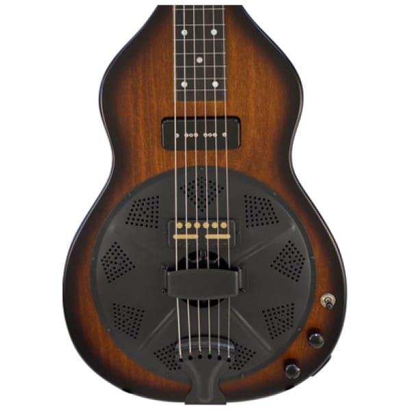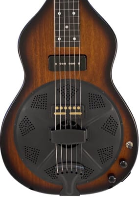 Beard Guitars Road-O-Phonic TS, Resonator Guitar with Pickup, Design: Squareneck Solidbody Resonator with three pickups and stereo/mono function, Body: Poplar, Resonator: 9″ Beard Handspun Aluminum Spider Bridge Cone, Neck: Poplar, Fingerboard: Ebony, White dot fingerboard inlays, Neck-body transition at the 10th fret, Scale: 635 mm (25″), Nut width: 48 mm (1.88″), Bone nut, 19 frets, Pickups: One Lollar P-90 F Spaced Black (neck), one Lollar Gold Foil 7.2K with custom satin black cover (middle) and one Fishman Nashville Spider piezo system in the bridge, Preamp: Fishman Power Chip, TRS splitter for stereo operation: Magnetic (1), Fishman (2) or all mixed mono, Composite bridge on maple, Gotoh black machine heads, Factory strings: .016 – .056, Colour: Tobacco Sunburst, Includes case, Made in USA