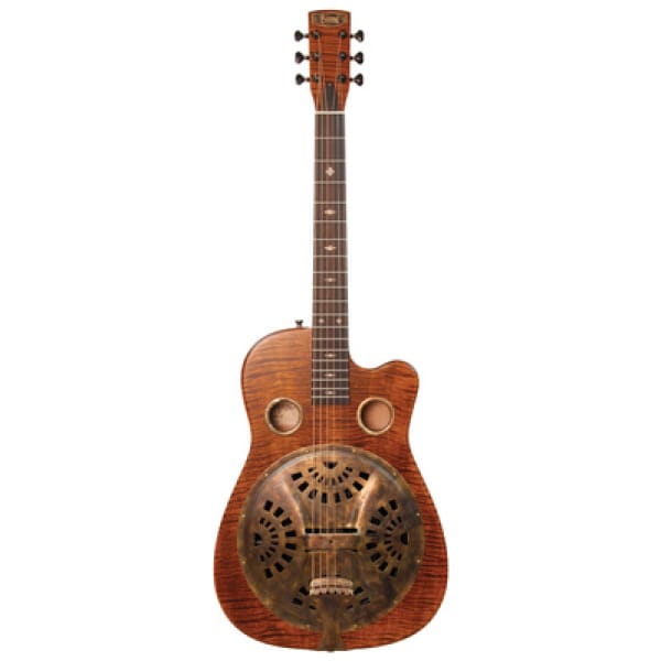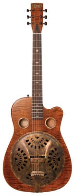 Beard Guitars Trailhead E-Model CE Tobacco, Roundneck Resonator Guitar with Pickup, cone: Beard Vesper Spider, back & sides: solid curly maple, top: solid curly maple, neck: mahogany, fingerboard: ebony (Diospyros Crassiflora), inlays: curly maple “Diamond”, 19 frets (12 clear of body), nut: bone, scale: 635 mm (25″), Pickup: Fishman Nashville Spider-Style Resophonic, Binding: curly maple, bridge: ebony capped maple, tuners: Gotoh, incl. Beard Deluxe hardcase, colour: Tobacco (satin), made in USA
