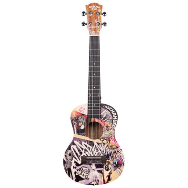 Cascha HH2608 Art Series Urban Tenor, Tenor-ukulele, Body: mahonie, Bovenblad: massief vuren, Hals: mahonie, Fingerboard en brug: WPC, Scale: 430 mm, Topkambreedte: 35 mm, 18 Frets, Verchroomde gesloten mechanieken, Voorgemonteerde snaren: Aquila Super Nylgut snaren, 2 Strap buttons, Kleur: Urban Design mat, Incl. gevoerde gigbag en 3 picks