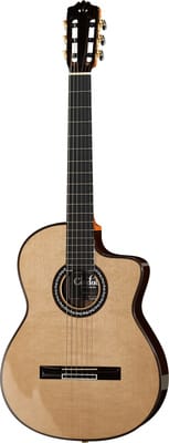 Cordoba GK Pro Negra, Flamenco gitaar, Met cutaway, Massief Europees sparren bovenblad, Zij- en achterkant van massief Indisch palissander, Mahonie hals, Ebbenhouten fingerboard, Scale: 650 mm, Topkam breedte: 50 mm, 19 frets, Topkam en brugzadel van been, Cordoba premium gouden mechanieken, Fishman Prefix Problend pickup systeem met 3-bands EQ, Snaren: Savarez Cristal Corum in High Tension 500CJ, Kleur: naturel hoogglans, Incl. Cordoba humidified archtop koffer