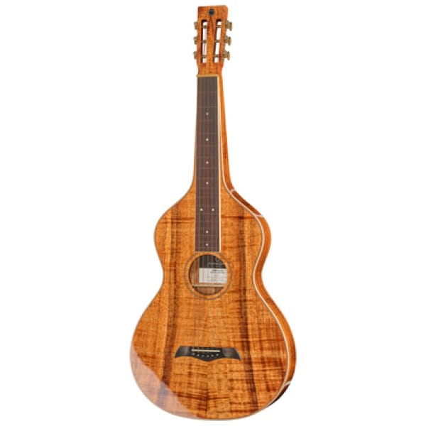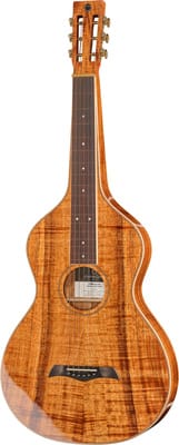 Cuntz Guitars CWB Weissenborn Koa HG, Weissenborn® Hawaiian Style Slide Bodyneck Guitar; Stability and sound-optimized replicas of the 1920s Weissenborn® guitars, selected solid 3A Koa top, neck, back and sides (Acacia koa); hollow neck integrated into the body; top bracing: modified X-bracing, scalloped; fingerboard made of East Indian rosewood (Dalbergia latifolia); Saddle bone, saddle width: 50mm; Scale length: 630mm; 17 marked frets (wood inlays); Tuning: DADF#AD or DGDGBD, strings: John Pearse new D-Tuning #3160, Gotoh SEP700 tuners; Finish natural high gloss, including case; made in Germany