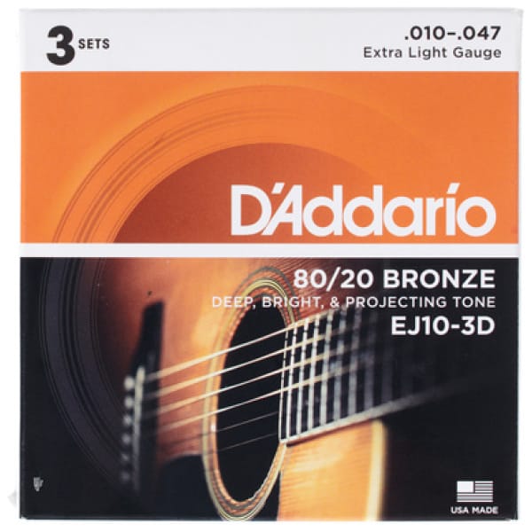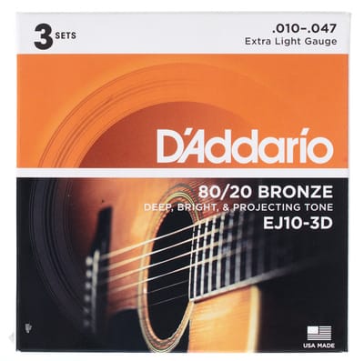 Daddario EJ-10-3D, Snarenset voor westerngitaar, Diktes: 010 – 014 – w023 – w030 – w039 – w047, 80/20 Bronze (messing), Round Wound, Heldere toon met grote briljantie, Inhoud: 3 complete sets snaren