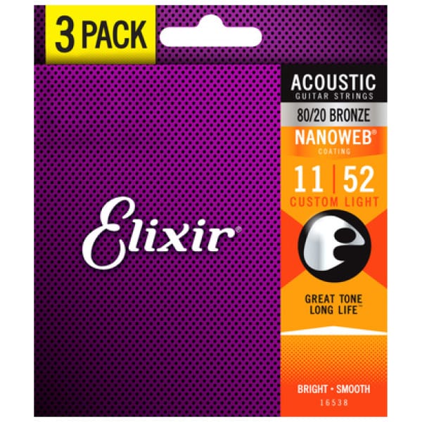Elixir Nanoweb Custom Light Acou- 3P, String Set voor akoestische gitaar, 3 Pack, Diktes: 0,011, 0,015, 0,022, 0,032, 0,042, 0,052, Materiaal: 80/20 Bronze, Nano Web Coating