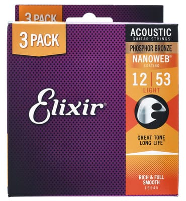 Elixir Nanoweb Light Phosphor Br. 3P, String set voor akoestische gitaar, 3 complete sets, Diktes: 012, 016, 024w, 032w, 042w, 053w, Materiaal: Phosphor Bronze, Nanoweb coating, Licht