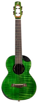 Flight Comet Tenor Ukulele GR, Tenor Ukulele with Pickup, With Scalloped Blackwood Cutaway, Spindle headstock, Top: solid flamed Maple, Back and sides: solid Mango, Neck: Mahogany, Fingerboard and bridge: Rosewood, Armrest and binding: Blackwood, Rosette: Blackwood, Dot fingerboard inlays, Nut width: 38 mm, Bone nut and saddle, 19 Frets, Pickup system: Double C1U Active Pickup, Pin bridge system, Colour: Green, high-gloss, Incl. gig bag