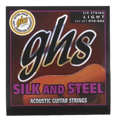 De GHS Silk and Steel 345 010-042 is een lichte snarenset voor akoestische gitaar met diktes van .010″ tot .042″. De snaren hebben een verzilverde koperen omwikkeling en een hexagonale snaarkern. Ze zijn gemaakt in de USA.