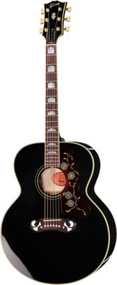 Gibson Elvis SJ-200, Westerngitaar@+ Het Gibson Elvis SJ-200-model is gebaseerd op een instrument dat Elvis kreeg tijdens een opnamesessie in Studio B in Nashville in het midden van de jaren 1960, en welke hij bespeelde tijdens talrijke live-optredens.@+@+, Bovenblad: massief vuren, Achterblad en zijkanten: massief esdoorn, 2-Strepige hals: esdoorn met walnotenhouten stringer, Fingerboard: palissander, Mother of pearl graduated crown fingerboard inlays, Scale: 648 mm (25,5″), Topkambreedte: 43,8 mm (1,73″), Topkam: been, 20 Frets, SJ-200 palissander moustache brug met mother of pearl hourglass en teardrop inlays, Brugzadel: been, Vergulde Grover Tulip stemmechanieken, Kleur: Ebony, Incl. koffer, Made in the USA