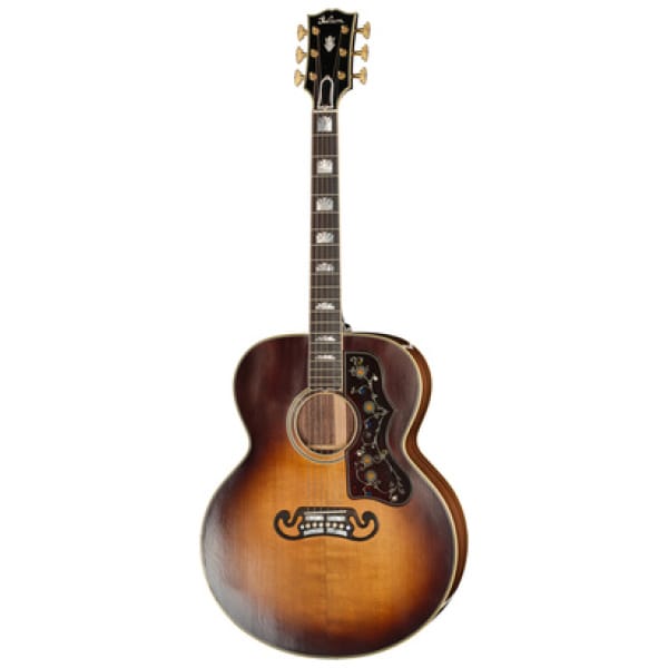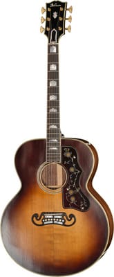 Gibson Pre-War SJ-200 RW LA FVS, Acoustic Guitar, Type: Jumbo, Thermally treated top: Solid red spruce, Back and sides: Solid rosewood, 2-piece neck: AAA maple, Fingerboard: Ebony, Mother-of-Pearl crown fingerboard inlays, Multi-ply binding on body top and bottom as well as headstock, Single-ply neck binding, Scale: 648 mm (25.5″), Nut width: 43.8 mm (1.72″), Bone nut, 20 frets, Tortoise SJ-200 pickguard, Ebony bridge with bone saddle, Grover Imperial machine heads, Finish: Light Aged, Colour: Faded Vintage Sunburst, Includes case, Made in USA