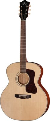 Guild F-40E Std PSB USA, Westerngitaar met pickup, Bodyvorm: Jumbo (J), Achterblad en zijkanten: massief mahonie, Bovenblad: massief vuren, Hals: mahonie, Fingerboard: palissander, Pearloid dot fingerboard inlays, Witte bodybinding, Fingerboardradius: 305 mm (12″), Scale: 651 mm (25,6″), Topkambreedte: 43 mm (1,69″), Topkam van been, 20 Frets, Pickup: L.R. Baggs Element VTC, Tortoiseshell celluloid slagplaat, Palisander brug met brugzadel van been, Open Guild Deluxe Vintage open gear met cream oval buttons, Voorgemonteerde snaren: D’Addario EXP16 – Coated Phosphor Bronze Light .012 – .053, Incl. COA koffer, linnen buidel en plectrums, Made in the USA