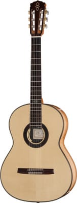 Hanika Custom 56 SBF, Classical Guitar with Pickup, Top: Solid spruce, Soundboard binding: 5-asym-flat, Top binding: Fibre, Back and sides: Split beech (composite), Back binding: White / Black / White, Side purfling: Rosewood, Headstock: Rosewood, Top shape: Hanika-Standard, Neck: Cedro, Fingerboard: Grenadilla, Fingerboard inlays: octave fret 3-rhombus (white), Side-Dots: 5+7, NEck profile: C-1 mm, Rosette: Macassar, Scale: 650 mm, 20 frets, Nut: Bone, Nut width: 48 mm, Pickup: Bridge: Rosewood, Saddle: Bone, Machine heads: R2, Lacquer: Matt HE (top), high-gloss HE (head/handle/body), Colour: Natural transparent, Includes Hanika Hiscox black case, Made in Germany