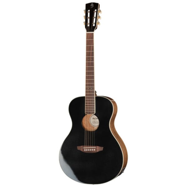 Harley Benton CLF-50E Black Metallic, Steel-String Guitar with Pickup, Style: Parlor, Back and sides: Selected Sonokeling mahogany, Top: Solid selected Canadian sitka spruce, Scalloped X-bracing, Dovetail neck joint at the 14th fret, Double action truss rod, Neck: Mahogany, Fingerboard: Rosewood, Elliptical fingerboard inlays, Slotted headstock, Cream-coloured body, neck and headstock bindings, Neck profile: D, Fingerboard radius: 380 mm, Scale: 630 mm, 20 premium silver-nickel frets, Nut width: 43 mm, Bone nut, Pickup system: Harley Benton HB-03 Preamp with integrated tuner, Bridge: Sonokeling rosewood, Cream-coloured bridge pins, Open chrome machine heads with 18:1 gear ratio, Strings: HQS WE 12-53 PB beschichtet (Art. #514184#), Colour: Natural high-gloss with black top
