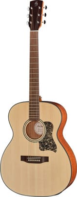Harley Benton CLO-65SE NT, Steel-String Guitar with Pickup, Style: Orchestra, Back and sides: Mahogany, X-bracing, Top: Solid spruce, Neck: Nato, Fingerboard: Pau ferro, 3 mm Pearloid dot fingerboard inlays and 1.5 mm dot side markers, Neck profile: C, Dovetail neck joint at the 14th fret, 400 mm double action truss rod, HB logo in mother-of-pearl, ABS body inlays, Abalone rosette, Fingerboard radius: 380 mm, Scale length: 649 mm, Nut width: 43 mm, Bone nut, 20 nickel frets, Pickup system: HB-03 Preamp with integrated tuner, Pau ferro bridge with bone saddle, Open chrome machine heads with 18:1 gear ratio, ABS bridge pins with black dot, Strings: Harley Benton HQS WE .012–.053 PB Coated (Art.#514184#), Colour: Natural matte