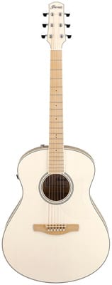 Ibanez AAM370E-OAW, Steel-String Guitar with Pickup, Style: Advanced Auditorium, Top: Solid Sitka spruce, X-M bracing, Back and sides: Flamed maple, Neck: Maple, Fingerboard: Maple, Black dot fingerboard inlays, Neck profile: Low Oval Grip, Rounded body edge binding, A.I.R. Port (sound hole) in the side, Scale: 643 mm (25″), Nut width: 43 mm, Bone nut, 20 frets, Pickup: Ibanez T-Bar Undersaddle with Ibanez Custom Electronis Preamp, Compensated bone saddle, Finish: Open pore, Colour: Antique White
