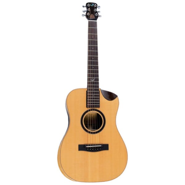 Journey Instruments OF422C, Overhead Travel Cutaway Acoustic-Electric Guitar, 00-body shape, patented detachable neck system which allows for assembly/disassembly in a matter of seconds, can be carried-on to most major airlines in its travel backpack, easily fitting in the overhead bin compartment, deeper than a standard Parlor guitar, astonishing volume and bass, dual-action steel truss-rod; Neck Scoop-Away for easy access to higher frets; Beveled arm rest; Back & Sides: Rosewood (Dalbergia Latifolia); Top: Solid Spruce; Neck: Carbon reinforced Mahogany; Fingerboard: Rosewood (Dalbergia Latifolia); Inlays: White Dots; 20 Frets; Nut: Bone; Nut Width: 44,5 mm (1,75″); Scale: 622 mm (24,5″); Binding: Maple; Pickup: Journey under-saddle, passive; Bridge: Compensated bone; Tuners: locking 18:1; TSA compliant Gigbag; Colour: Natural; Stock Strings: Elixir Phosphor-Bronze