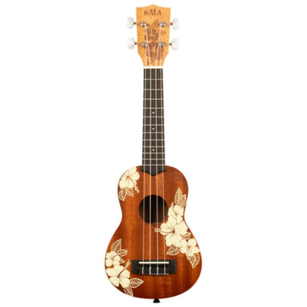 Kala KA-HIBISCUS-S Mahogany Uke, Sopraan-ukelele, The Voyage Collection Serie, Bovenblad met artistiek “Resourceful” (Hibiscus) motief van Maori kunstenaar Sam Mangakahia, Bovenblad: mahonie, Achterblad en zijkanten: mahonie, Hals: mahonie, Fingerboard: palissander, Totale lengte: 530 mm, Scale: 343 mm (13,5″), 18 Frets, Graph Tech NuBone topkam en brug, Open stemmechanieken met witte stemknoppen, Originele snaren: Aquila Super Nylgut, Kleur: Naturel Zijdemat, Incl. Voyage Collection Bag