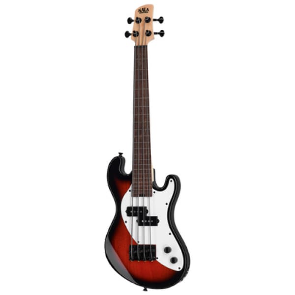 Kala U-Bass Solid Body 4-String TB, Fretloze elektrische basukulele, Fretless model met lijnen, Body: okoumé, Geschroefde hals: esdoorn, Fingerboard: laurier, Scale: 597 mm (23,5″), Totale lengte: 845 mm, Pickups: 1 Kala split coil, Volume en tone control, Witte slagplaat, Gesloten basstemmechanieken met 1:18 overbrengingsverhouding, Zwarte hardware, Originele snaren: Kala Round Wound, Kleur: Tobacco Burst Hoogglans, Incl. gigbag