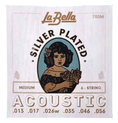 De La Bella 700M Silver Plated is een snarenset voor Westerngitaar met snaardiktes van .013 tot .056 en medium tension. De snaren zijn gemaakt van verzilverd koperdraad en met de hand gewikkeld op een stalen kern voor een helder en scherp geluid. Ze hebben iets minder spanning dan omwikkelde snaren van brons of messing. De snaren zijn verpakt in een aangepaste atmosfeer om de versheid te behouden en aantasting te voorkomen. De wikkeling is van silver plated copper en het type omwikkeling is round wound. De set is made in the U.S.A.