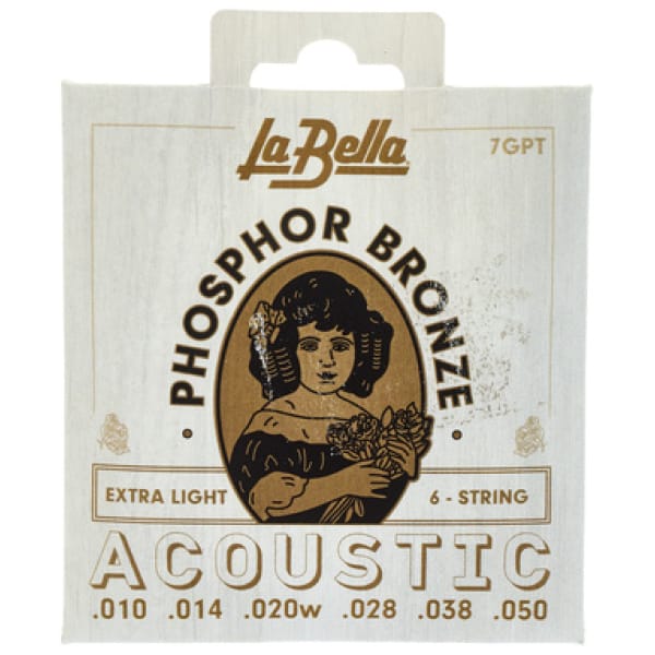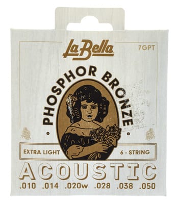 De La Bella 7GPT Phosphor Bronze XL is een set snaren voor een westerngitaar. De snaren zijn gemaakt van phosphor bronze en hebben diktes van .010, .014, .020W, .028, .038 en .050. Ze zijn round wound en worden geleverd in een verbeterde afgesloten verpakking om aantasting te voorkomen en de versheid te garanderen. De snaren zijn gemaakt in de USA.
