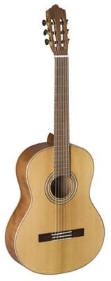 La Mancha Cereza, Klassieke gitaar, Grootte: 4/4, Hout by rECOtimber, Bovenblad: massief Duits sparrenhout, Achterblad en zijkanten: kersenhout, Hals: elzenhout met koolstofversterking, Fingerboard: eucalyptus, Spaanse hals/body-verbinding, Eucalyptus brug met dubbele boring, Topkam en brugzadel vervaardigd uit been, Bindings: esdoorn, Scale: 650 mm, Topkambreedte: 52 mm, Gouden mechanieken met zwarte vleugels, Voorgemonteerde snaren: Savarez Cantiga Mixed Tension 510MRJ, Kleur: Naturel met hoogglans afwerkingslaag