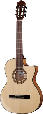 De La Mancha Perla Ambar S/63-CER is een 7/8 klassieke gitaar met een pickup. Deze gitaar heeft een small neck met cutaway en is voorzien van een massief Duits vurenhouten bovenblad en generfd esdoornhouten onderblad en zijkanten. De hals is gemaakt van Toona Kalantas met carbon versterking en het fingerboard is van ovangkol. De gitaar heeft een Spaanse hals-body verbinding en notenhouten bindingen. De scale is 630 mm en de topkambreedte is 47 mm. De BR-1 pickup systeem zorgt voor een uitstekende geluidskwaliteit. De ovangkol brug heeft een dubbele boring en de topkam en brugzadel zijn gemaakt van been. De zwarte deluxe stemmechanieken met zwarte vleugels zorgen voor een stabiele stemming. De gitaar wordt geleverd met voorgemonteerde snaren: Savarez Cantiga Mixed Tension 510MRJ. De kleur van de gitaar is Amber/Naturel hoogglans.