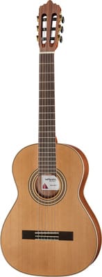 De La Mancha Rubi CM/59 is een klassieke gitaar met een 3/4 grootte en een massieve top van Canadees cederhout. De achterkant en zijkanten zijn gemaakt van mahonie en de hals is van toona kalantas met koolstof versterking. De gitaar heeft een scale van 59 cm en een topkam breedte van 49 mm. De Spaanse hals/body verbinding en de fretboard en brug van ovangkol maken de gitaar compleet. De La Mancha Rubi CM/59 wordt aanbevolen door de EGTA als model 2017/2018.