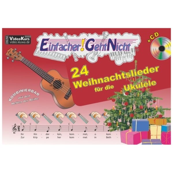 Het LeuWa-Verlag 24 Weihnachtslieder Ukulele boek bevat 24 kerstliedjes gearrangeerd voor ukulele, inclusief akkoorden en teksten. Het boek heeft een gemakkelijke moeilijkheidsgraad en kan gecombineerd worden met andere boeken uit deze reeks. Het boek is in het Duits en heeft een formaat van DIN A4 liggend met 28 pagina’s. Bij het boek zit een CD met demo- en play-along-opnamen en een online videocursus. ISBN 9783940533692.