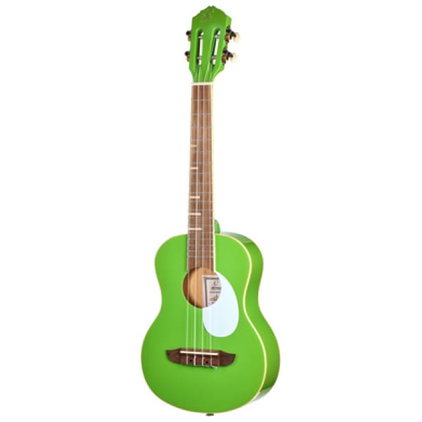 Ortega RUGA-GAP Ukulele, Tenor ukulele, Bovenblad: agathis, Achterblad en zijkanten: agathis, Hals: okoumé, Fretboard: walnoot, Scale: 432 mm, Topkambreedte: 37 mm, Ivory ABS binding, 18 Frets, Teardrop slagplaat, Brug: walnoot, Verchroomde mechanieken met witte kunststof knoppen, Voorgemonteerde snaren: Ortega UWNY-4-TE, Kleur: Green Apple hoogglans, Incl. qua kleur afgestemde gigbag