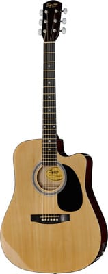 Squier SA-105CE NA, Westerngitaar met pickup, Ontwerp: dreadnought met cutaway, Bovenblad: gelamineerd sparren, Achterblad en zijkanten: gelamineerd nato, Hals: nato, Fretboard: gelakt esdoorn, Scale: 643 mm, Topkambreedte: 43 mm, 20 Frets, Pickup: Fender FE-A2, Brug: gelakt esdoorn met gecompenseerd brugzadel, Die-cast stemmechanieken, Kleur: Naturel