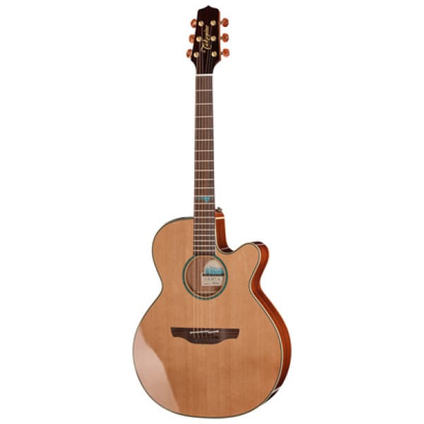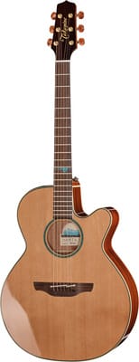 Takamine FSF40C; acoustic steel guitar; Bodyform NEX with cutaway; top solid cedar; back and sides solid sapele; body binding black; neck mahogany; fretboard and bridge rosewood (Dalbergia Latifolia); rosette abalone; scale 644mm; nut width 42,50mm; pickup takamine CTF-2N Preamp system; finish natural gloss; incl. softcase; Made in Japan