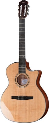 De Taylor 314ce-N is een moderne nylon-snarige Grand Auditorium gitaar met een cutaway voor gemakkelijke toegang tot de hogere frets. Het halsgevoel is aanzienlijk dunner dan bij normale concert gitaren, met een zadelbreedte van 47,6 mm. Deze gitaar biedt de legendarische Taylor speelbaarheid en is uitgerust met gepatenteerde Taylor ES-2 elektronica, inclusief actieve volume, treble en bass controls.
