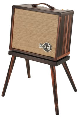 Taylor Amp Circa 74 AV150-10 Macassar; Specialmodel from Macassar Ebony;amplifier for acoustic guitar (Acoustic-Vocal); Power: 150 watts RMS; Speaker: 10-inch full-range (254 mm); Channels: 2 independent channels for guitar and vocals; Controls: Independent levels for both channels; master volume; 3-band EQ; room reverb; Input A: XLR or 1/4-inch (6.35 mm) for mic or guitar; Input B: 1/4-inch (6.35 mm) for guitar; plus: 1/8-inch (3.5 mm) line-level aux input; Outputs: XLR and 1/4-inch (6.35 mm) line out; 1/8-inch (3.5 mm) headphone out; Bluetooth Connectivity: Bluetooth button and indicator; Input Power Range: 100-240V; Dimensions: 419 mm x 229 mm x 356 mm; Cabinet Material: Macassar Ebony, Wooden Macassar Ebony Stand included (425 mm x 235 mm x 406 mm)
