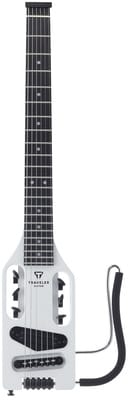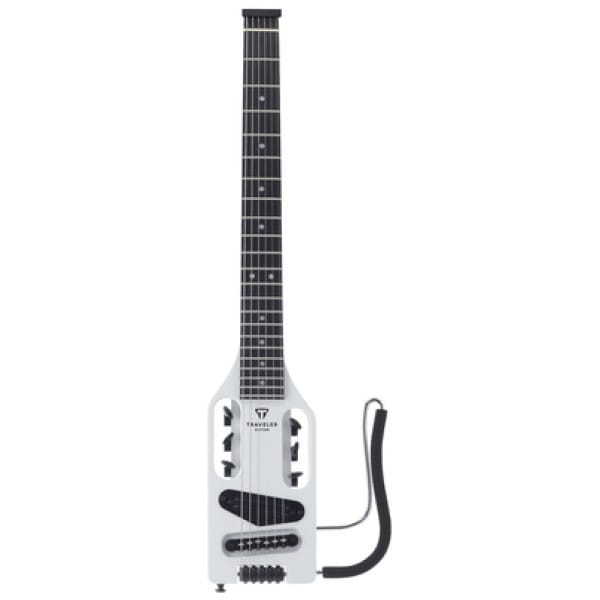 Traveler Guitar Ultra Light Electric SW, Compact Travel Electric Guitar, Total length: 711 mm, Body: Eastern American hard maple, Neck-thru-body: Eastern American hard maple, Fingerboard: Black walnut, Dot fingerboard inlays, Fingerboard radius: 400 mm, Scale: 628 (24/.75″), 22 medium frets, Nut width: 44.45 mm, Pickup: Passive Dual-Rail Humbucker, Passive electronics, Sealed machine heads with 14:1 gear ratio, Chrome hardware, Removable lap rest with comfort foam, Strings: D’Addario EXL110, Weight: 1.42 kg, Colour: Satin White, Includes Deluxe gig bag